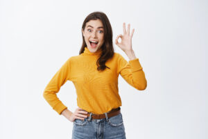 Home > Blog > ÉLJEN AZ AUTOKONTROLL! > Excited young woman advertising good product, showing OK sign and say yes, approve something cool, praise awesome choice, standing happy against white background